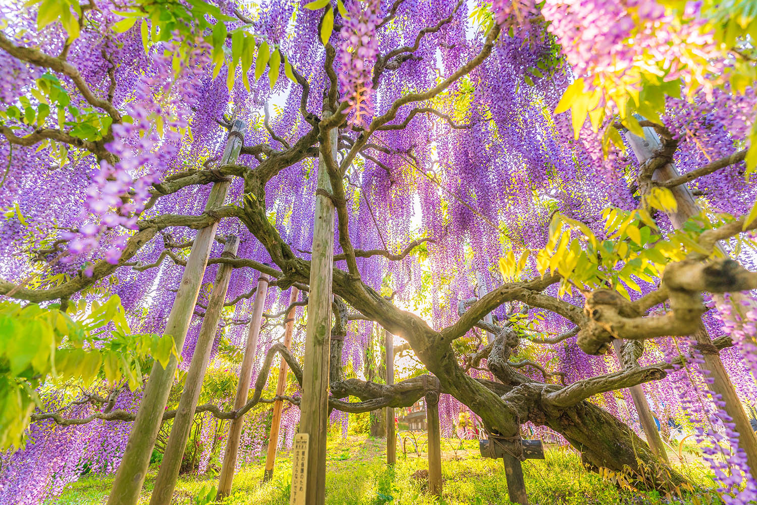 白藤、紫藤、粉藤交織成層次豐富的花景,隨著日夜光影變化展現不同風貌。這裡不只是賞花名所,更是一段關於時間、耐心與自然共生的故事。紫藤緩慢生長、年年盛放,也提醒旅人——有些美,需要等待,卻值得一生記住。