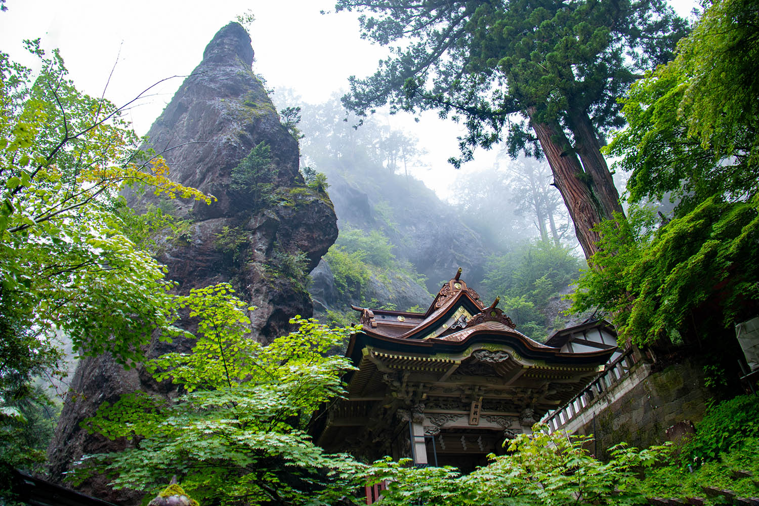 沿著參道前行,巨木環繞、岩壁聳立,朱紅社殿鑲嵌於山岩之間,彷彿與自然共生。